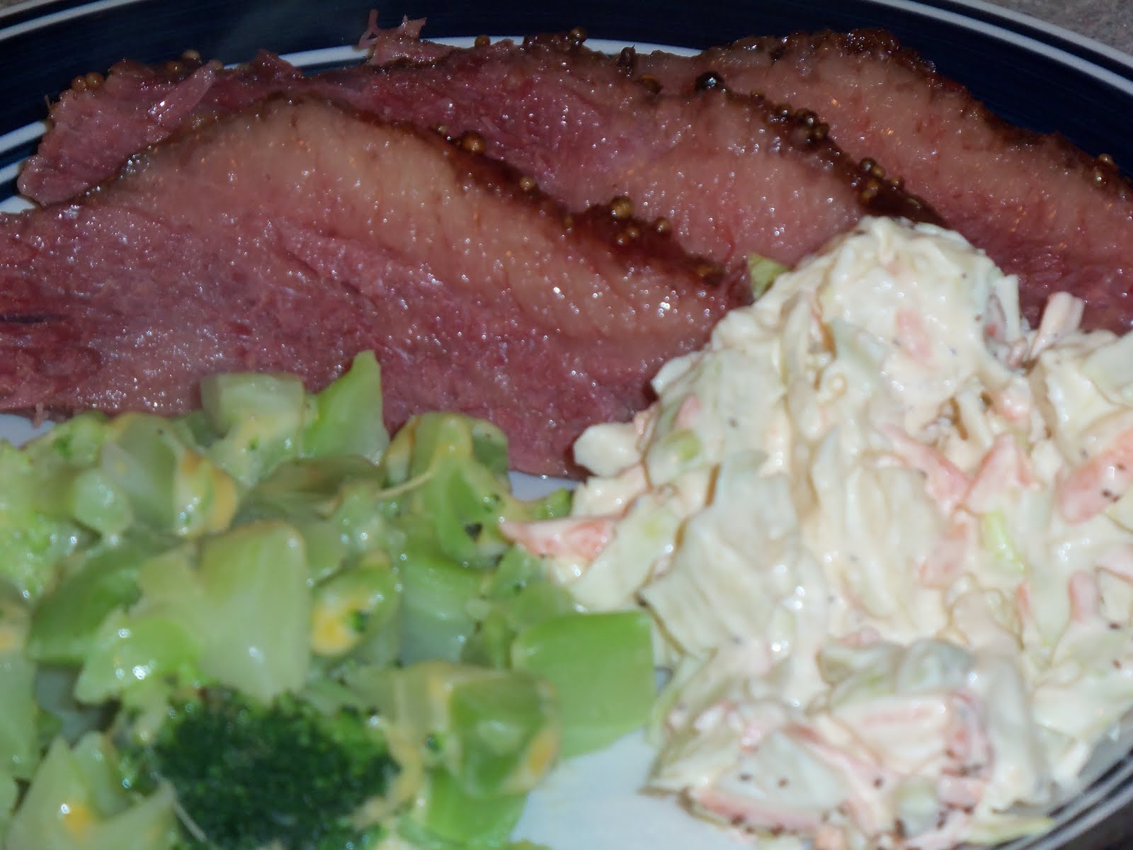 for sides tonight i have a coleslaw (i love slaw ON my sandwich) and... i made a mustard BBQ sauce. Hard rolls, and corn. My secret to cole slaw is Marzetti.. slaw sauce.